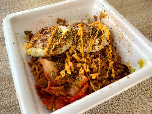 - 六厘舎カップ焼きそば with 目玉焼きx2 and 鶴橋製キムチ@備蓄より。